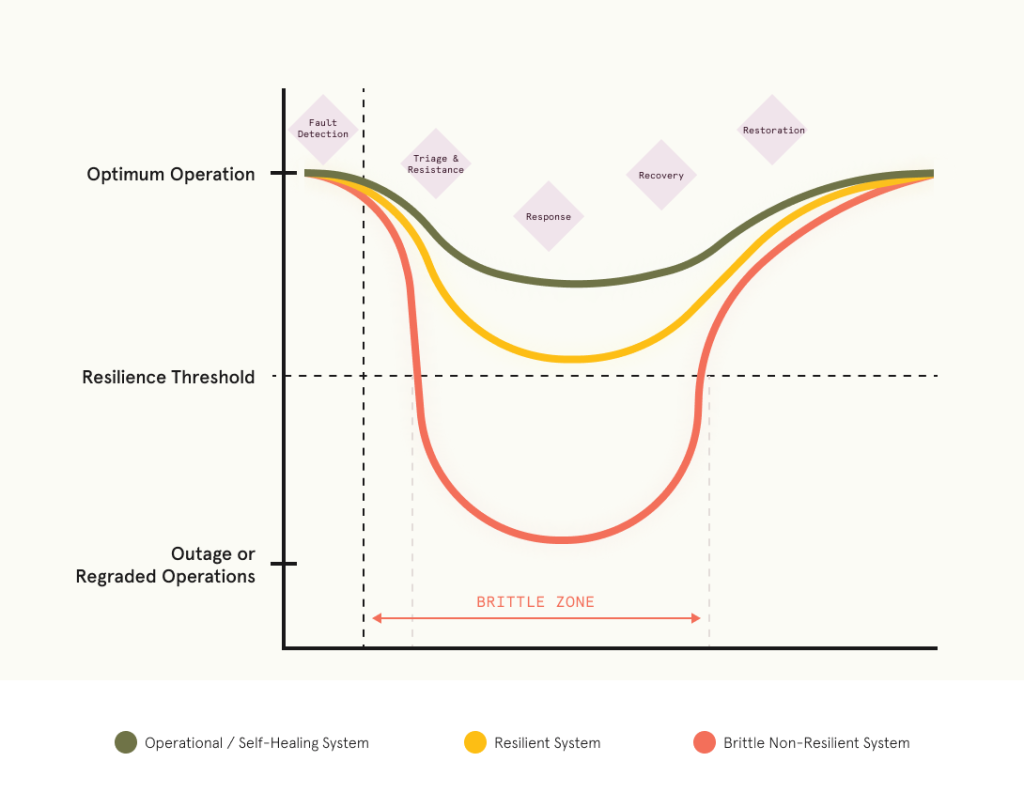 Evaluating existing technology resilience is the next step. Organizations should assess their maturity on an S-curve, examining whether they possess resilient system architecture and software across the stages of a typical outage or service degradation event. Such an assessment may be different for the particulars of your organization but in general the following questions should be answerable on a continuous basis: